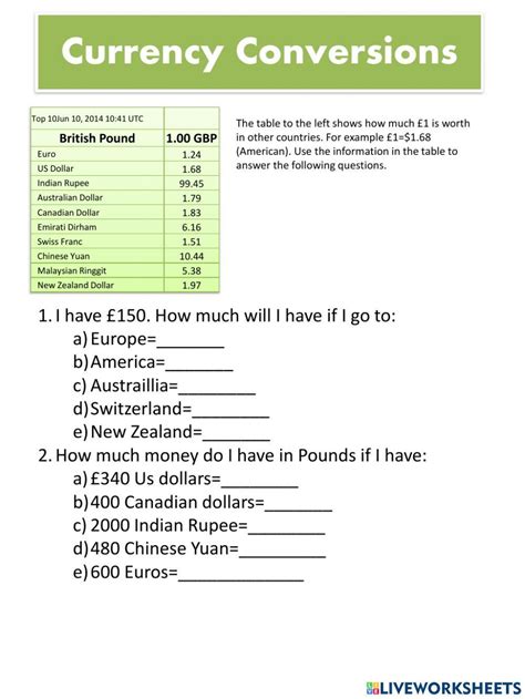 Web a printable maths worksheet on currency conversion: Web this excel spreadsheet consist of two worksheet. With a conversion rate provided and the opportunity to round to the.